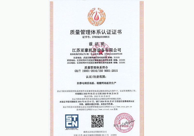 江蘇亞豪機(jī)房設(shè)備有限公司創(chuàng)建于2015年,坐落在蘇錫常中心地帶,是一家專(zhuān)業(yè)活動(dòng)地板制造商,集設(shè)計(jì)、制造、銷(xiāo)售、安裝一體并通過(guò)ISO9001質(zhì)量管理體系認(rèn)證。